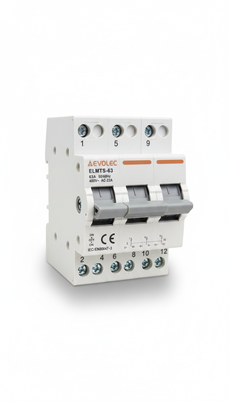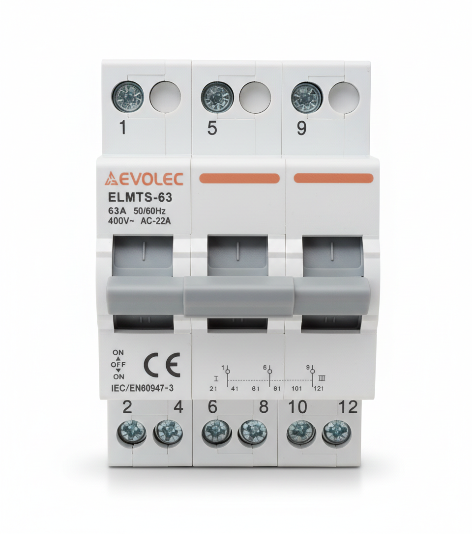 The Changeover Switch can switch on, load and break the circuit under normal conditions. Technical Data Rated Voltage: 240/415V Rated Current: 63A Rated Frequency: 50/60Hz Number of Poles: 3P Contact form: 1-0-2 Electrical Life: 1500 Cycles Mechanical Life: 8500 Cycles Protection degree: lp20 Ambient Temperature: -5°C~40°C Terminal/Cable size: 16mm2 Mounting: On DIN rail EN60715(35mm) by means of fast clip device.